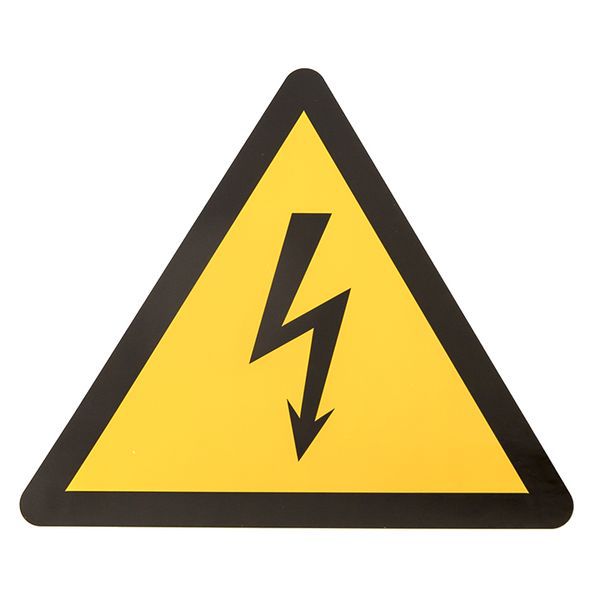 Представляет собой черный треугольник на желтом фоне с изображением знака молния", без надписей. Изготовлен из самоклеящейся пленки.